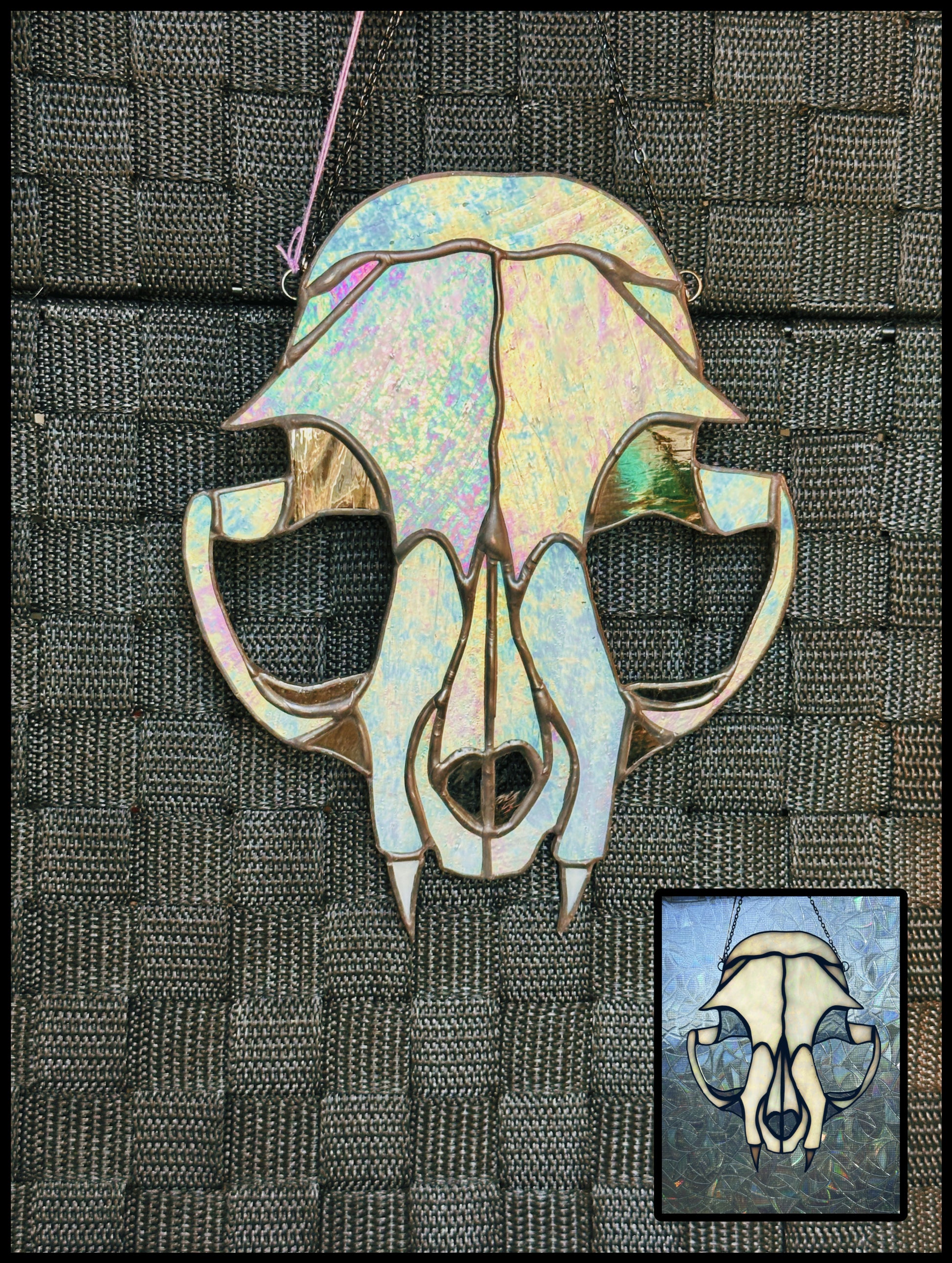 Embrace the eerie elegance of the "Feline Phantasm," a stained glass sun catcher that captures the haunting beauty of a cat's skull, set against a mesmerizing rainbow backdrop. This enchanting piece not only casts vibrant colors across your space but also whispers tales of the supernatural, making it a perfect addition for those who revel in the macabre. Let the spectral glow of this unique artwork illuminate your home, inviting both admiration and intrigue. 🐾💀🌈