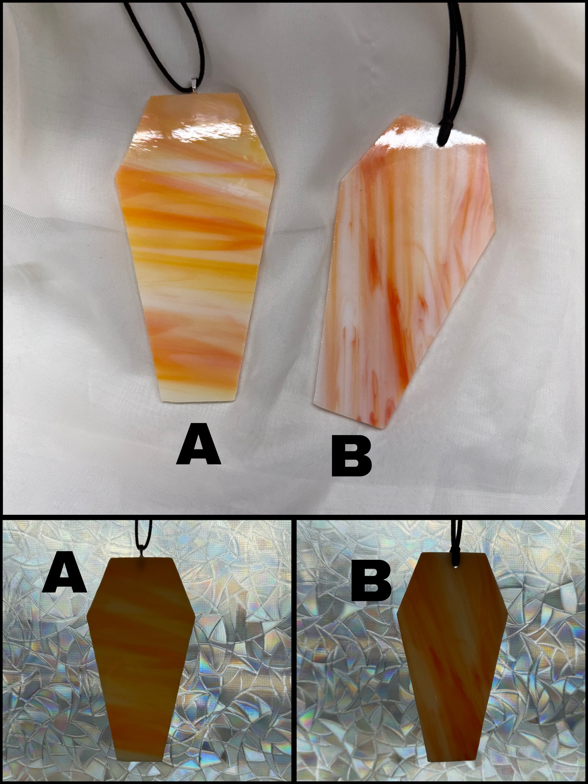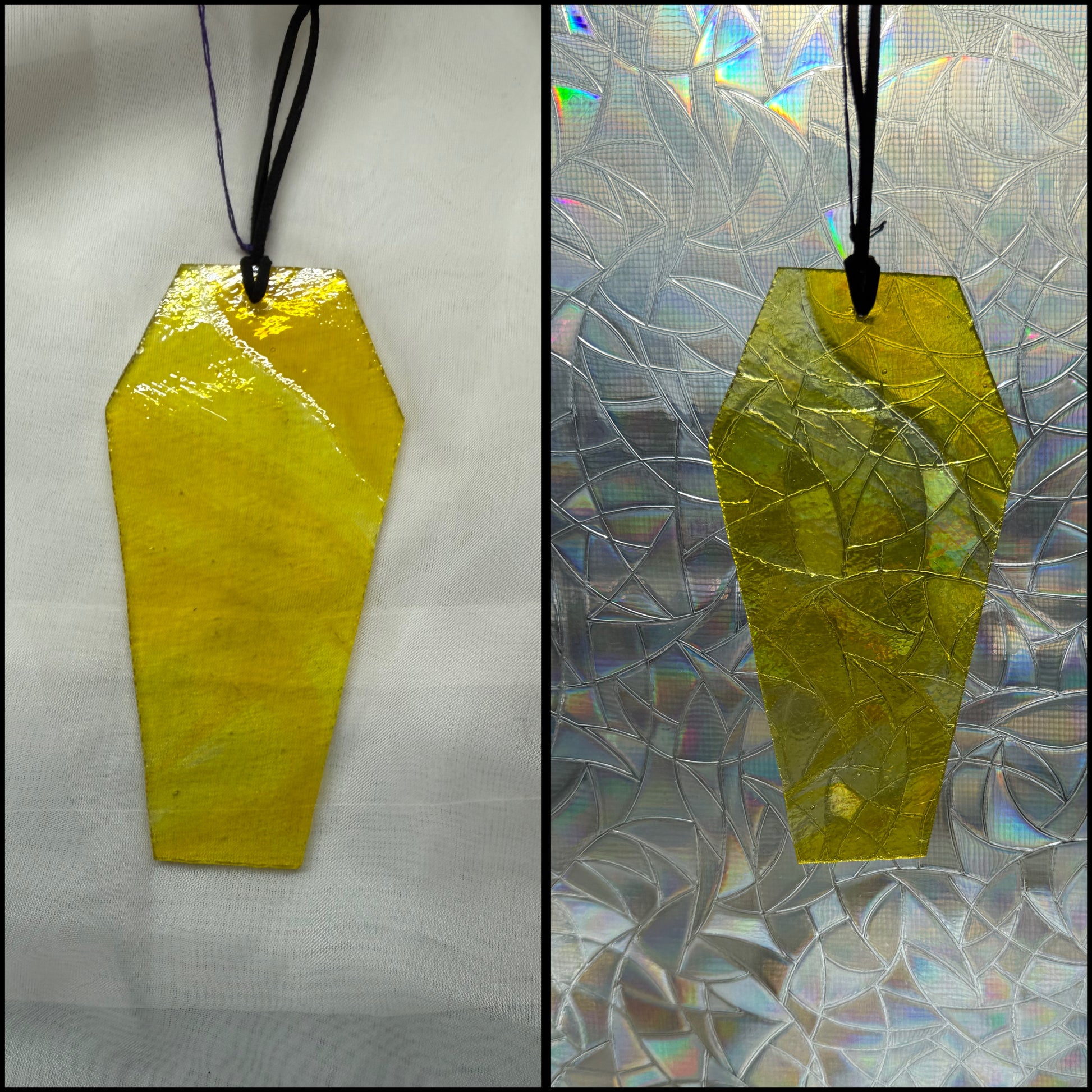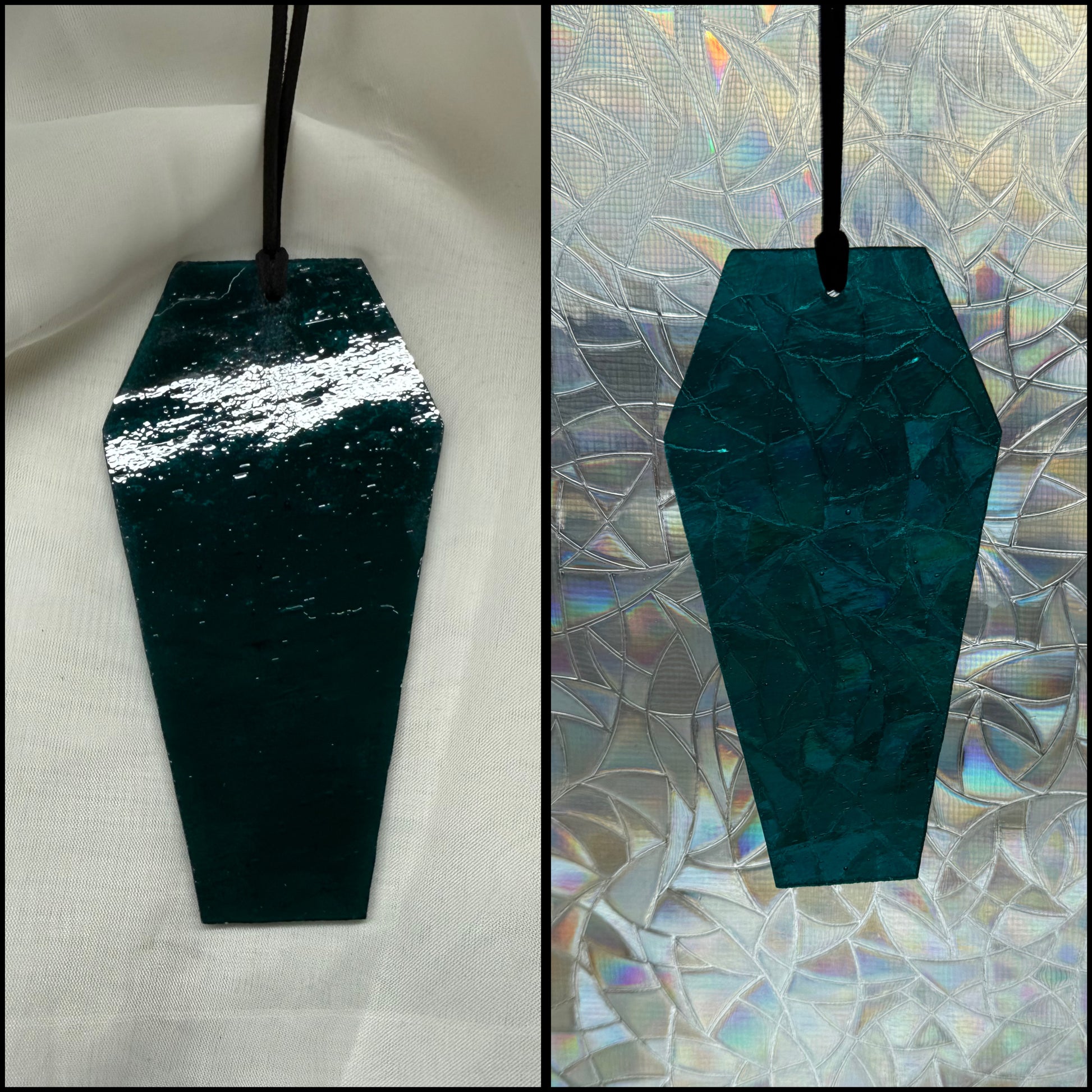Rest in style with this unique coffin! Featuring gorgeous, hand-made stained glass in a sun-catcher, it's sure to be the envy of the graveyard. So lay down your cares with this spook-tacular coffin, and prepare for a peaceful - and stylish - eternal slumber!!