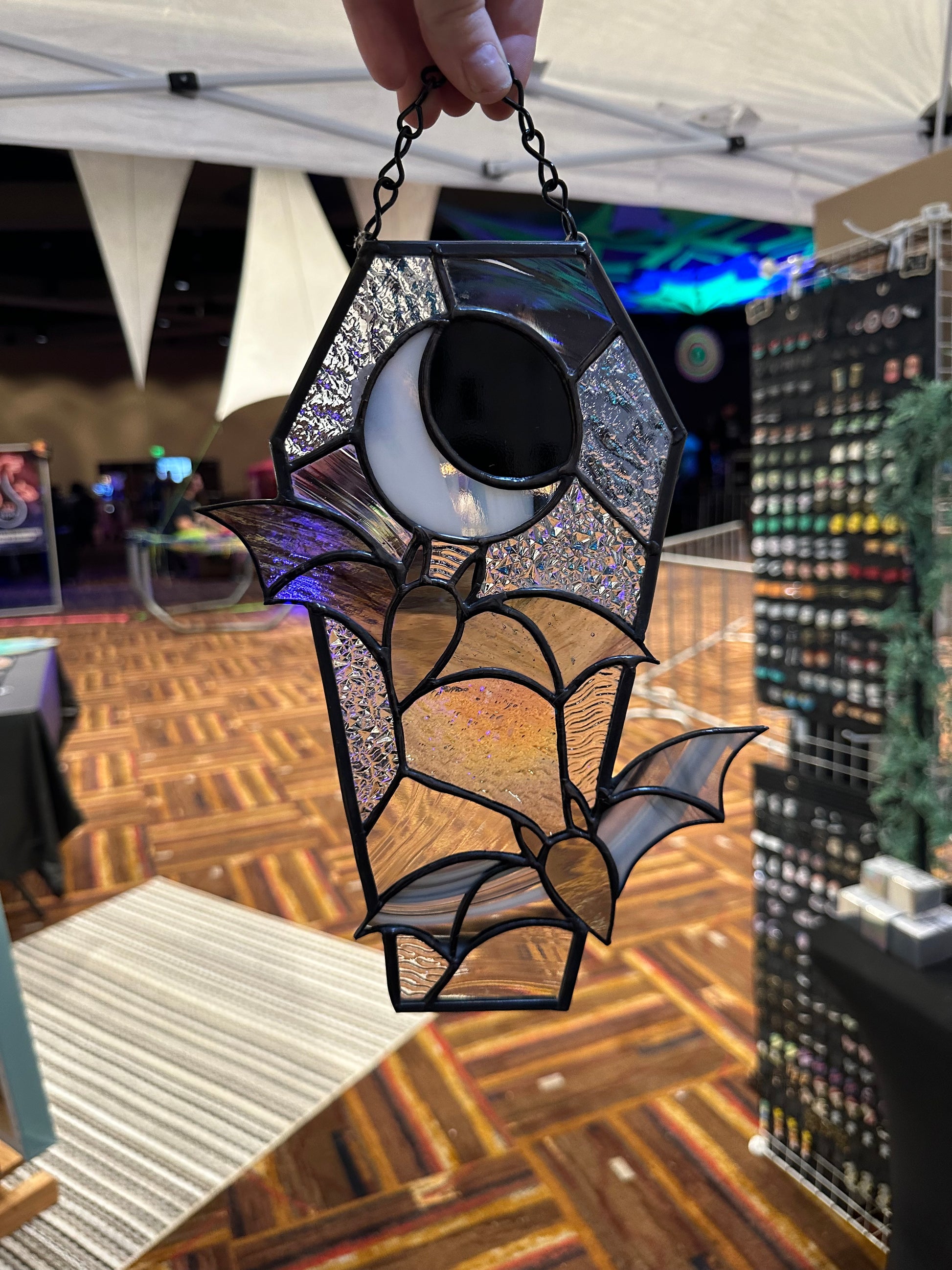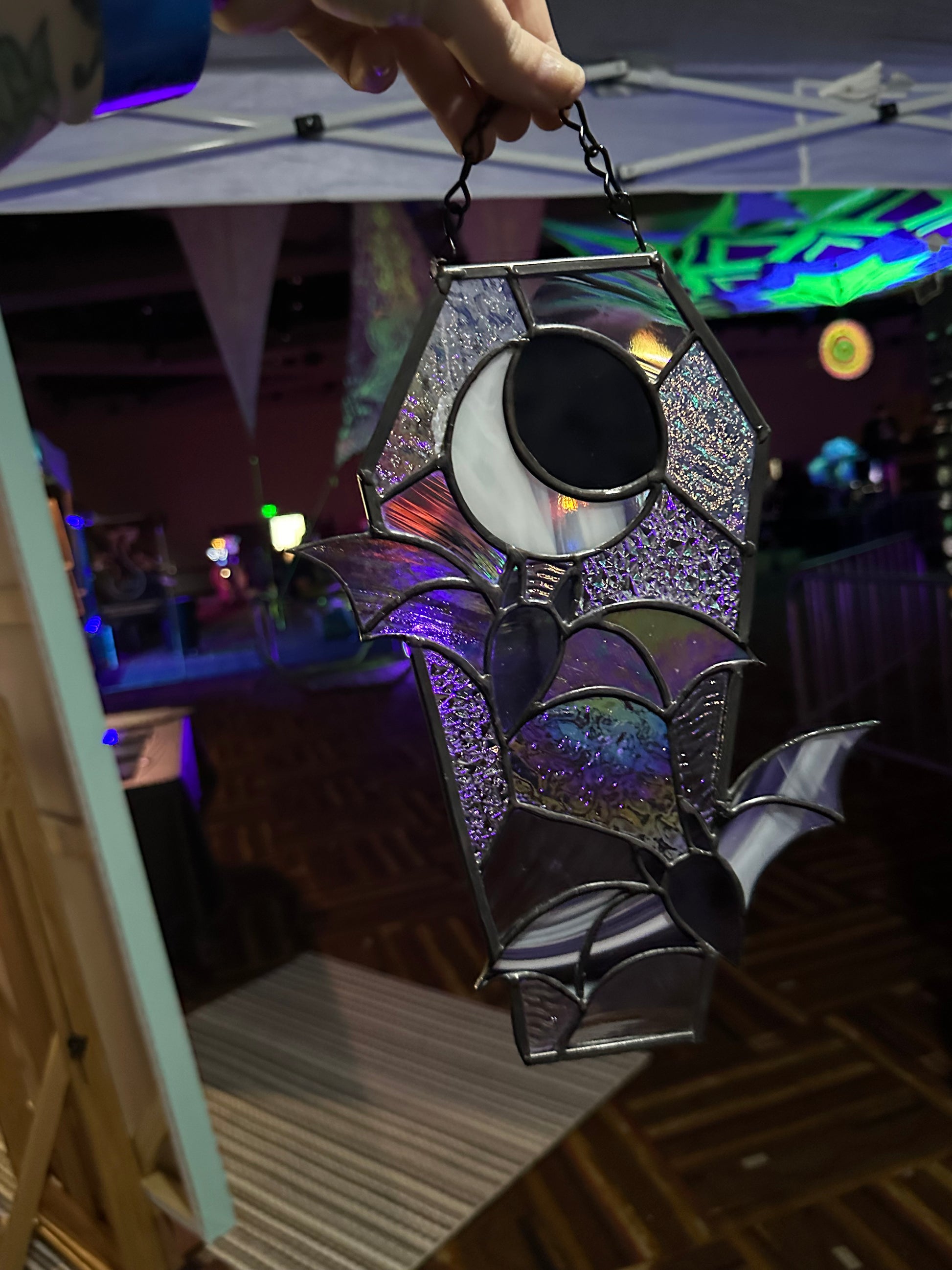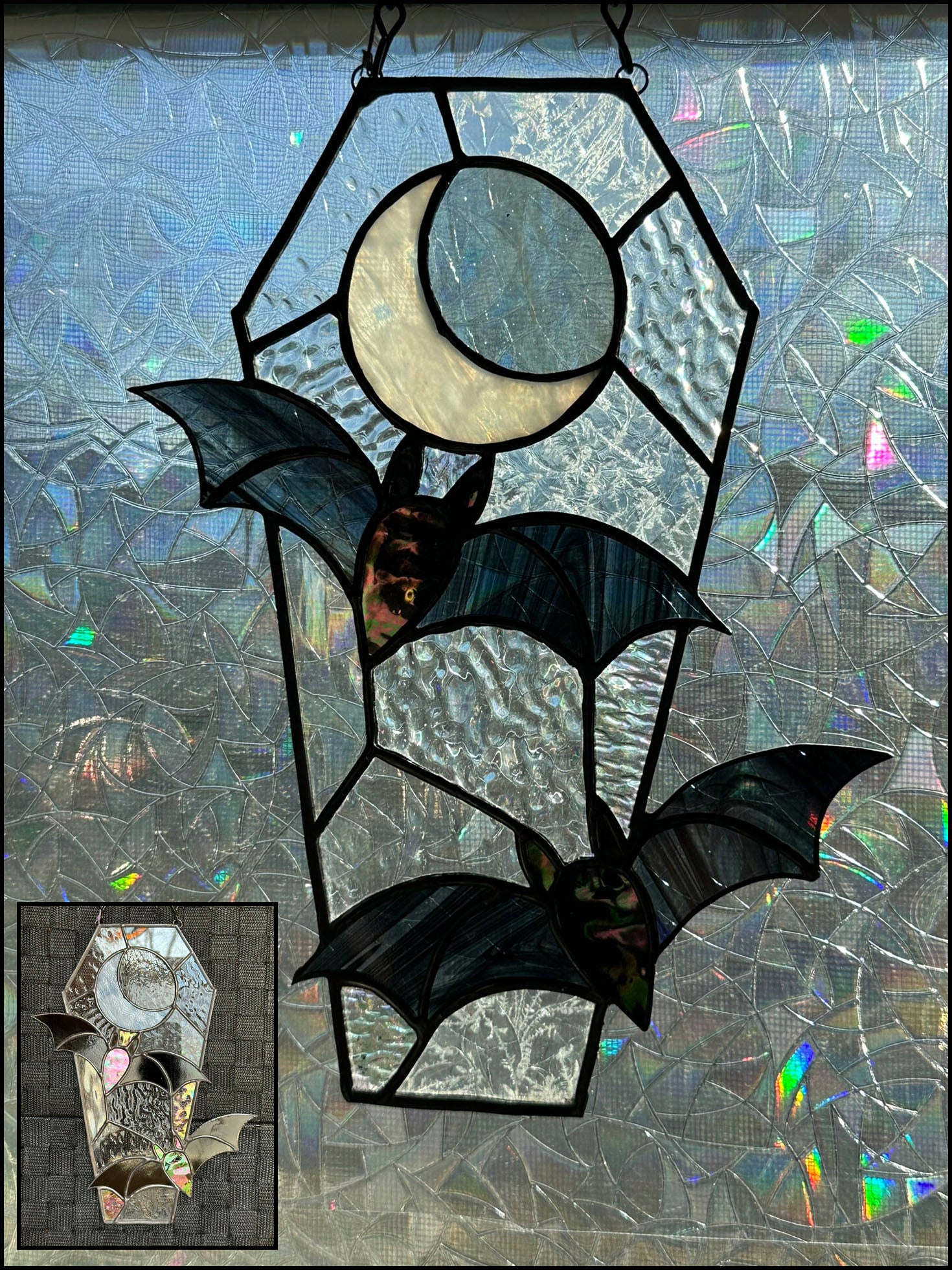 Take a whimsical journey with Midnight Flight. Our coffin-shaped stained glass panel features bats flying through the night. Perfect for adding a touch of charm to your home decor. Embrace the dark side in style.