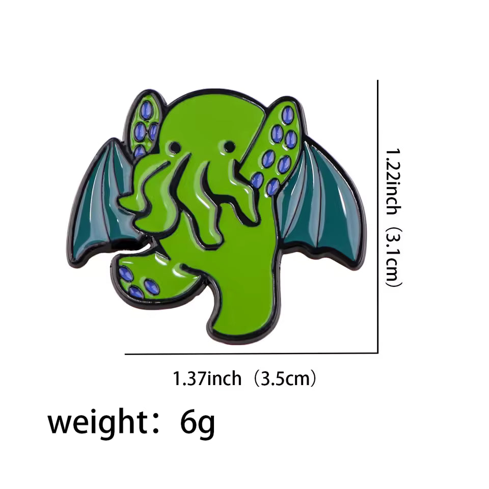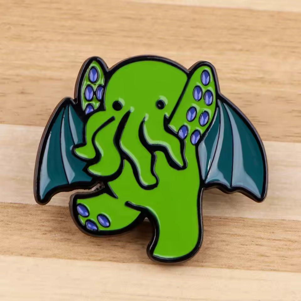 Add a touch of cosmic mischief to your collection with this playful Cthulhu enamel pin. Perfect for fans of the mysterious and the mythical, this pin brings the legendary sea creature to life in vibrant colors and fine detail. Pin it on your jacket, backpack, or hat to show off your love for the strange and the curious with a wink.