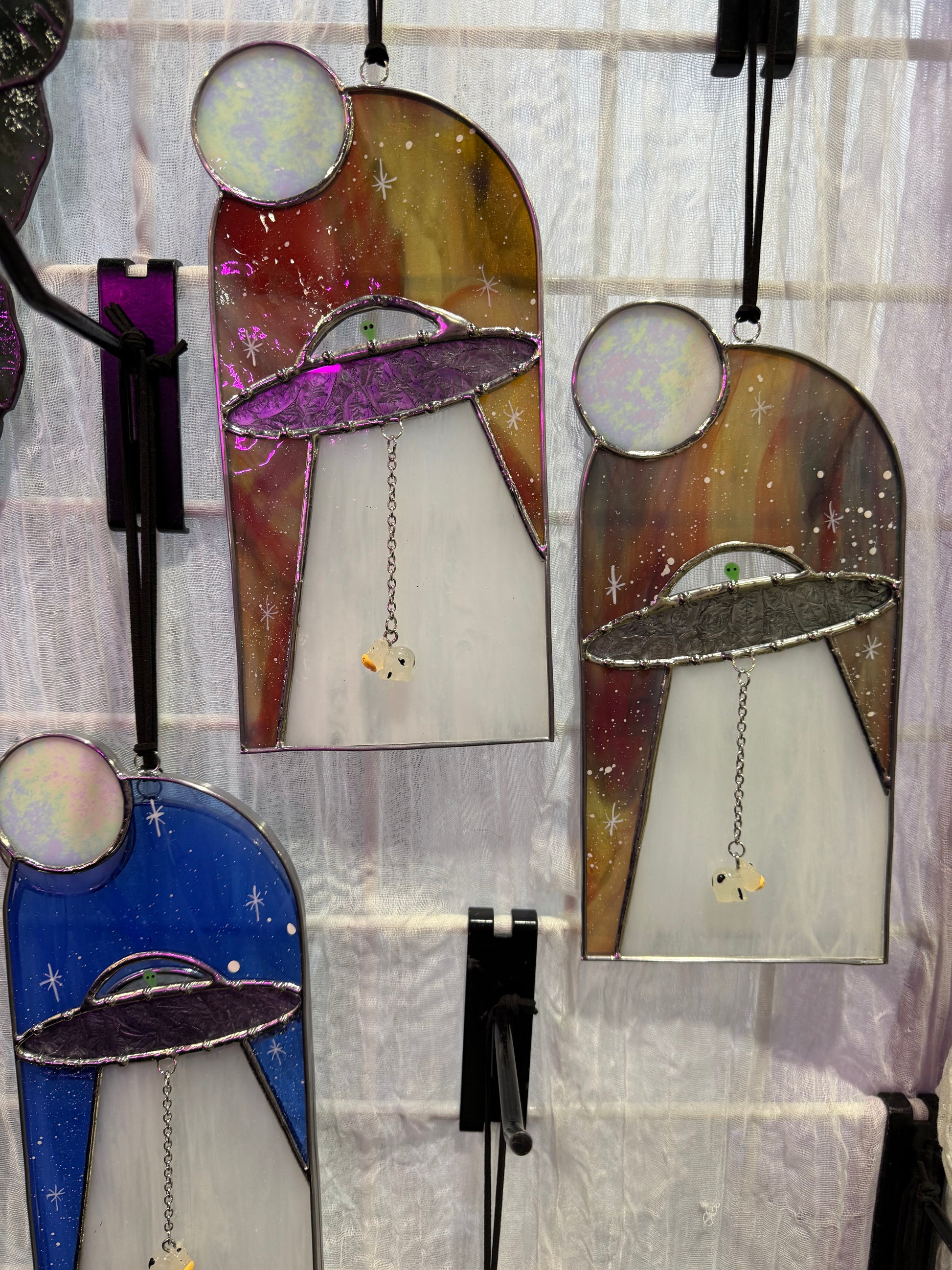 Embrace the eerie allure of the night with our captivating stained glass suncatcher, where a whimsical flying saucer hovers against a haunting full moon, abducting a cow that glows ominously in the dark. This enchanting piece not only casts a spectral glow in your space but also serves as a conversation starter, drawing the curious and the brave alike. Perfect for those who revel in the macabre, this suncatcher transforms any window into a portal of otherworldly charm, inviting the mysteries of the universe into your home.