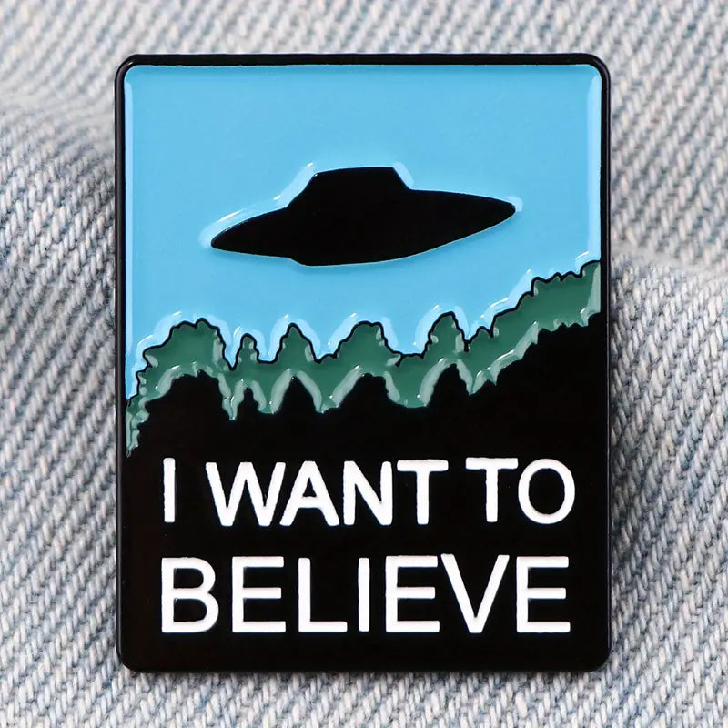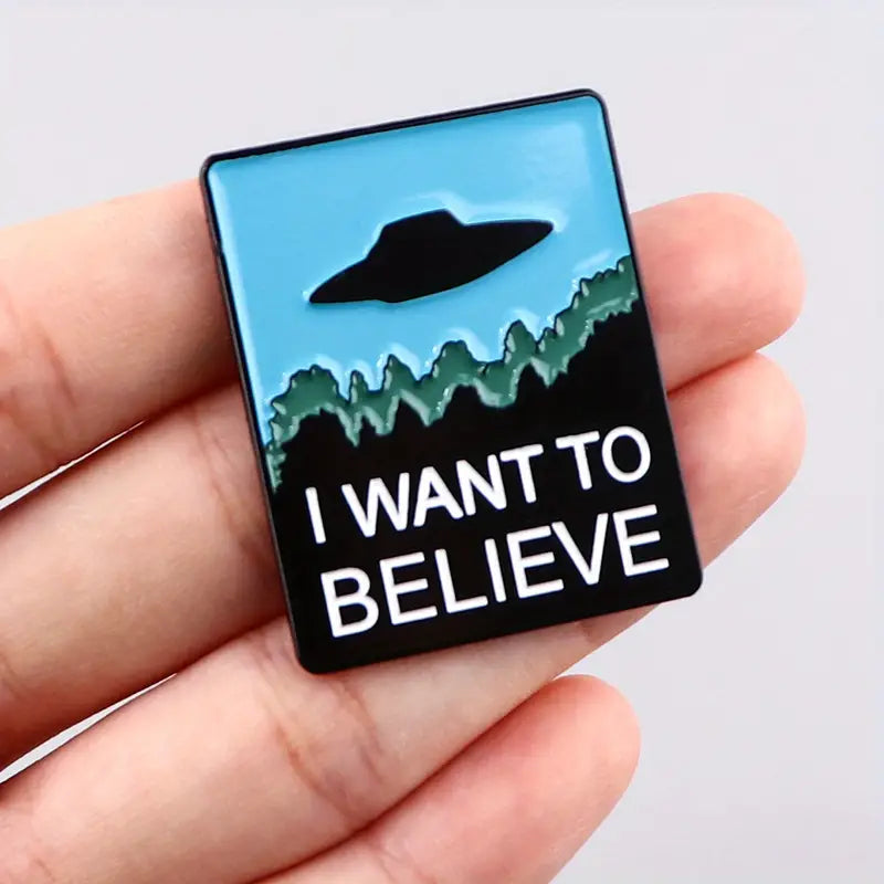 Indulge your inner XFiles fan with our "I Want to Believe" enamel pin! Featuring the iconic poster design, this pin adds a touch of mystery and nostalgia to any outfit. Join the believers and show off your love for the unknown with this quirky accessory.