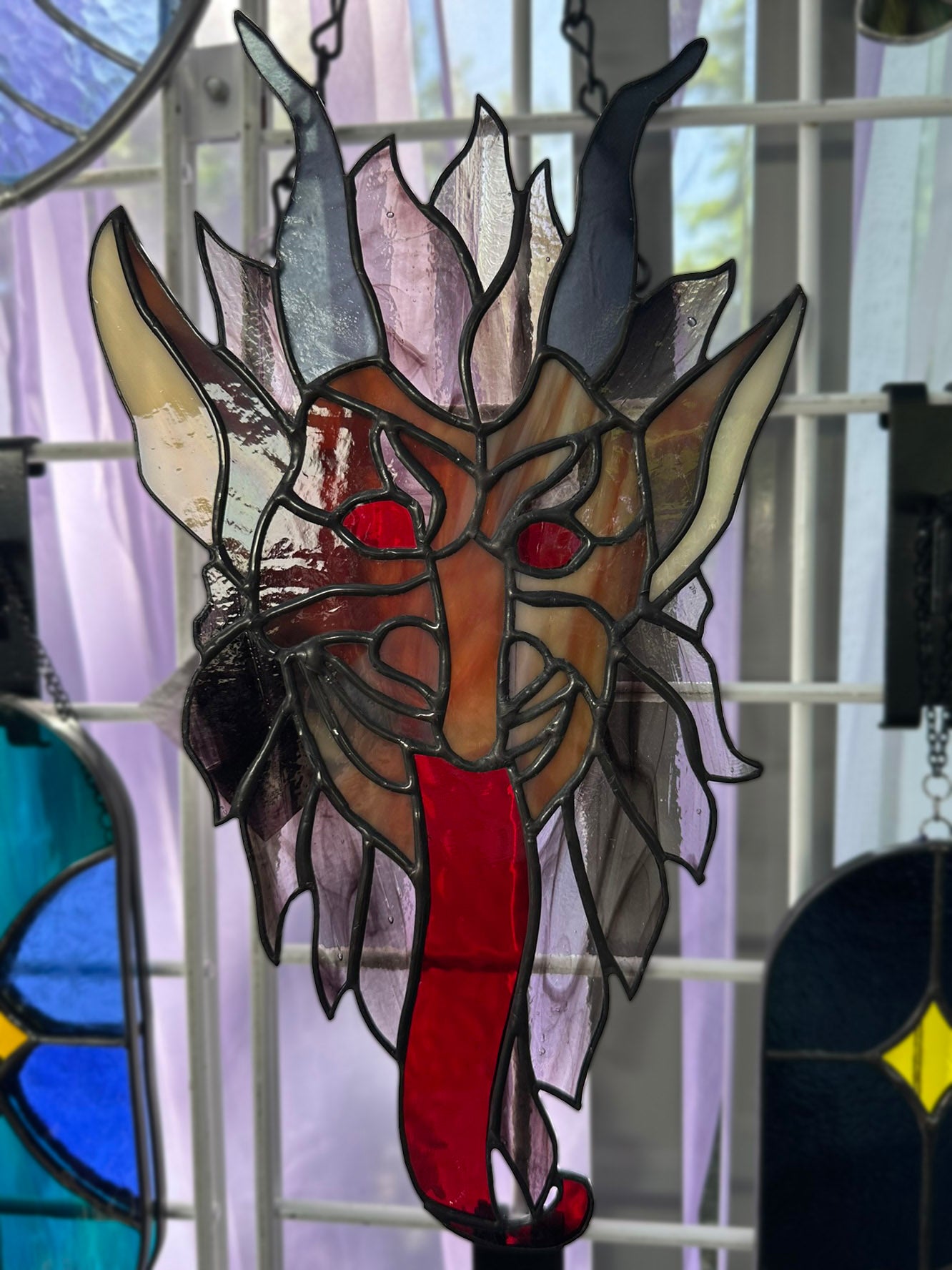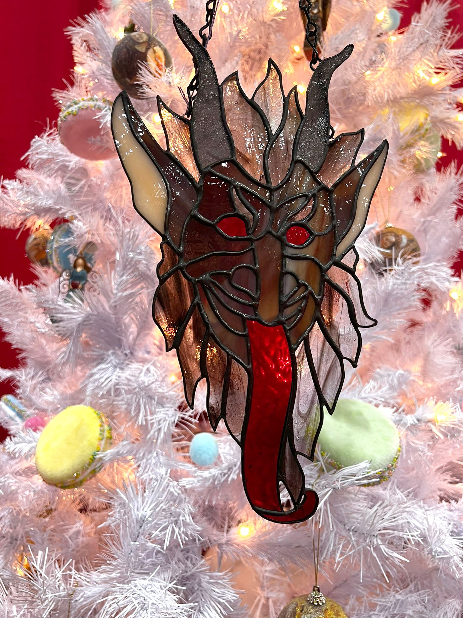 Unleash some holiday mischief with Krampus, an unusual stained glass panel featuring the mythical beast. Perfect for adding a touch of dark humor to your festive decor. (Naughty or nice, this unique piece is sure to turn heads.)