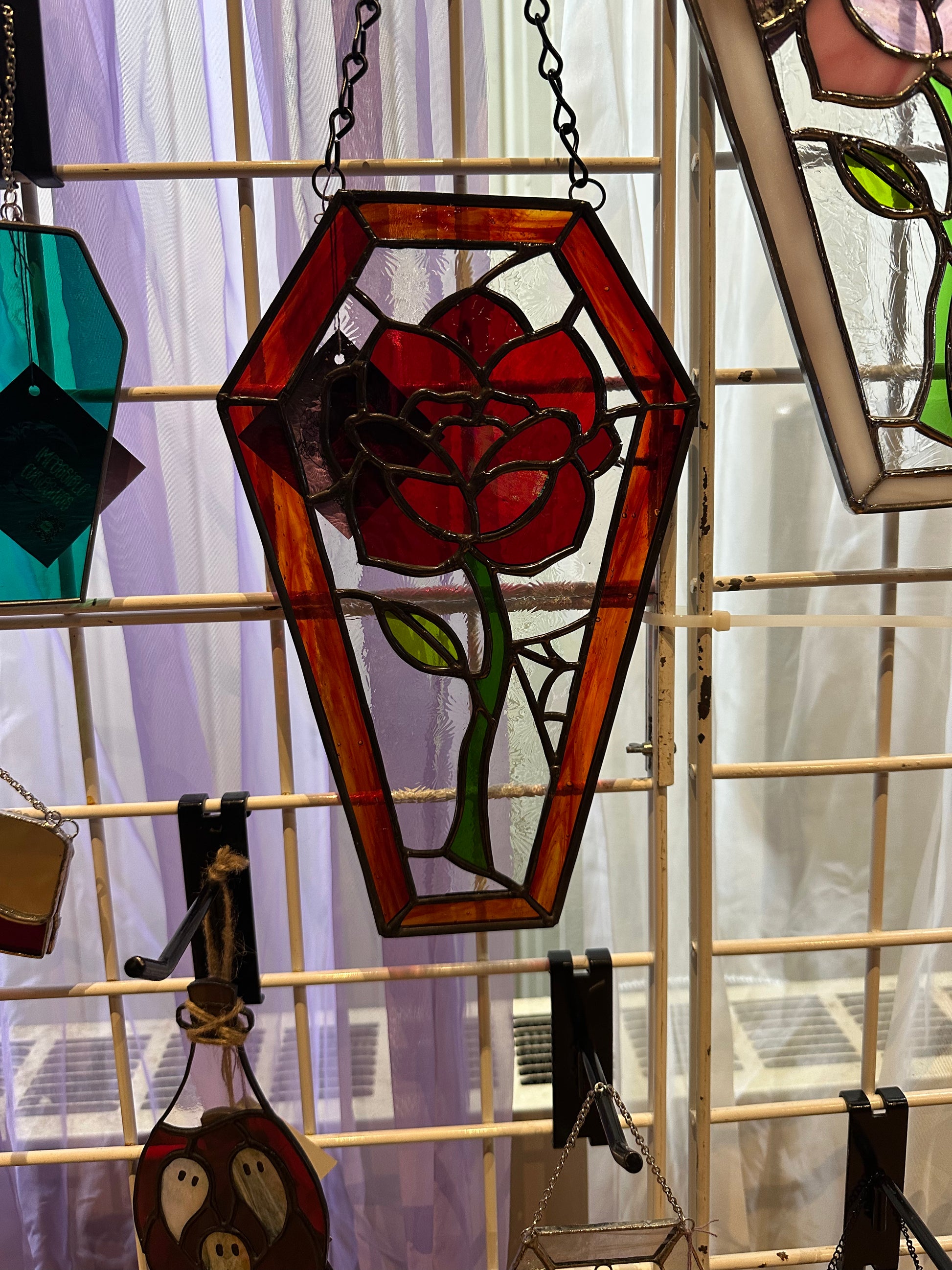Capture the beauty of a rose forever with our Eternal Rose stained glass sun catcher. The rose inside a coffin adds a quirky touch to your home decor. A unique and lasting piece to adorn your windows. (Death never looked so pretty.)