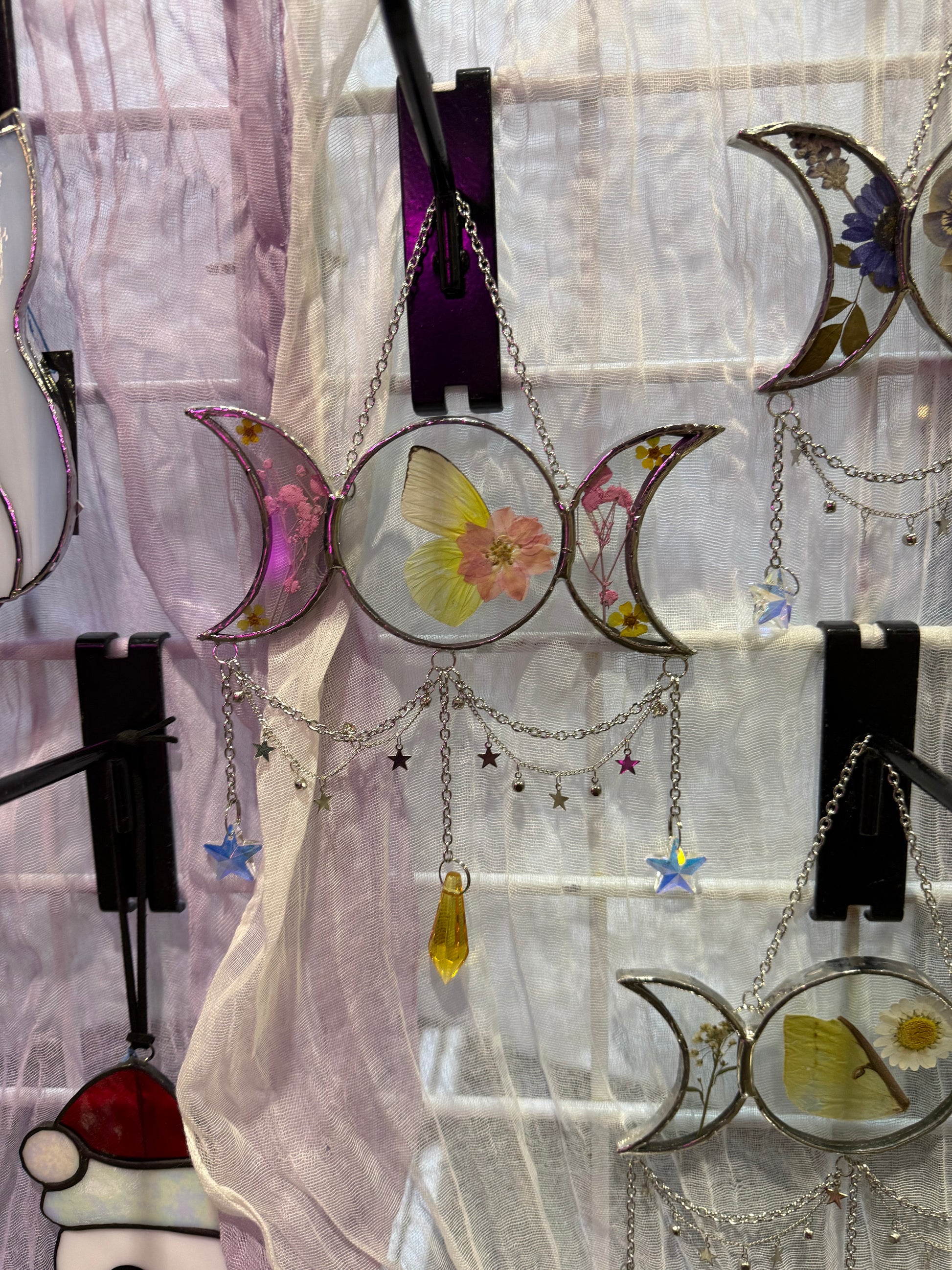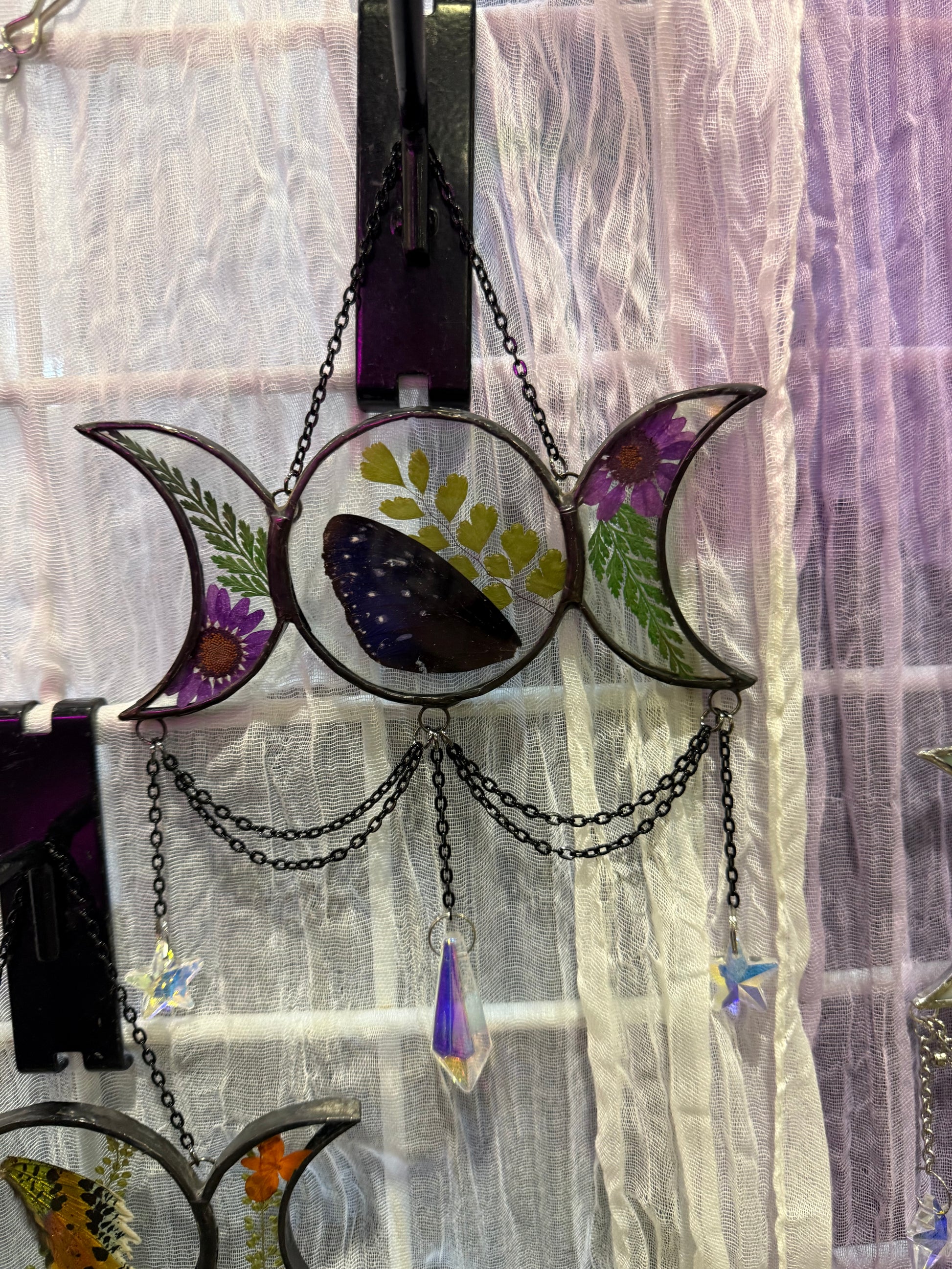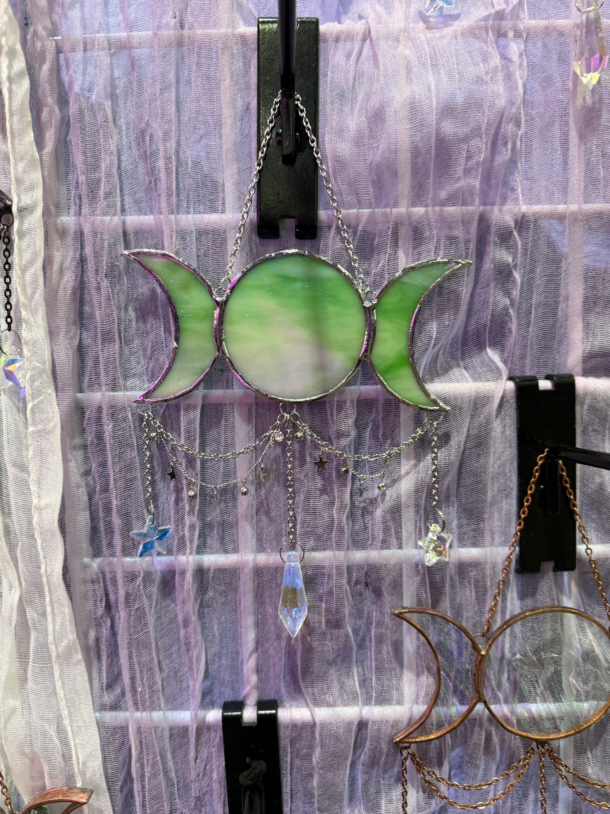 Bring a little magic to any interior with this enchanting stained glass Triple Moon sun catcher. Hang it in your windows and let its three crescent moons bring a touch of celestial light into your home!