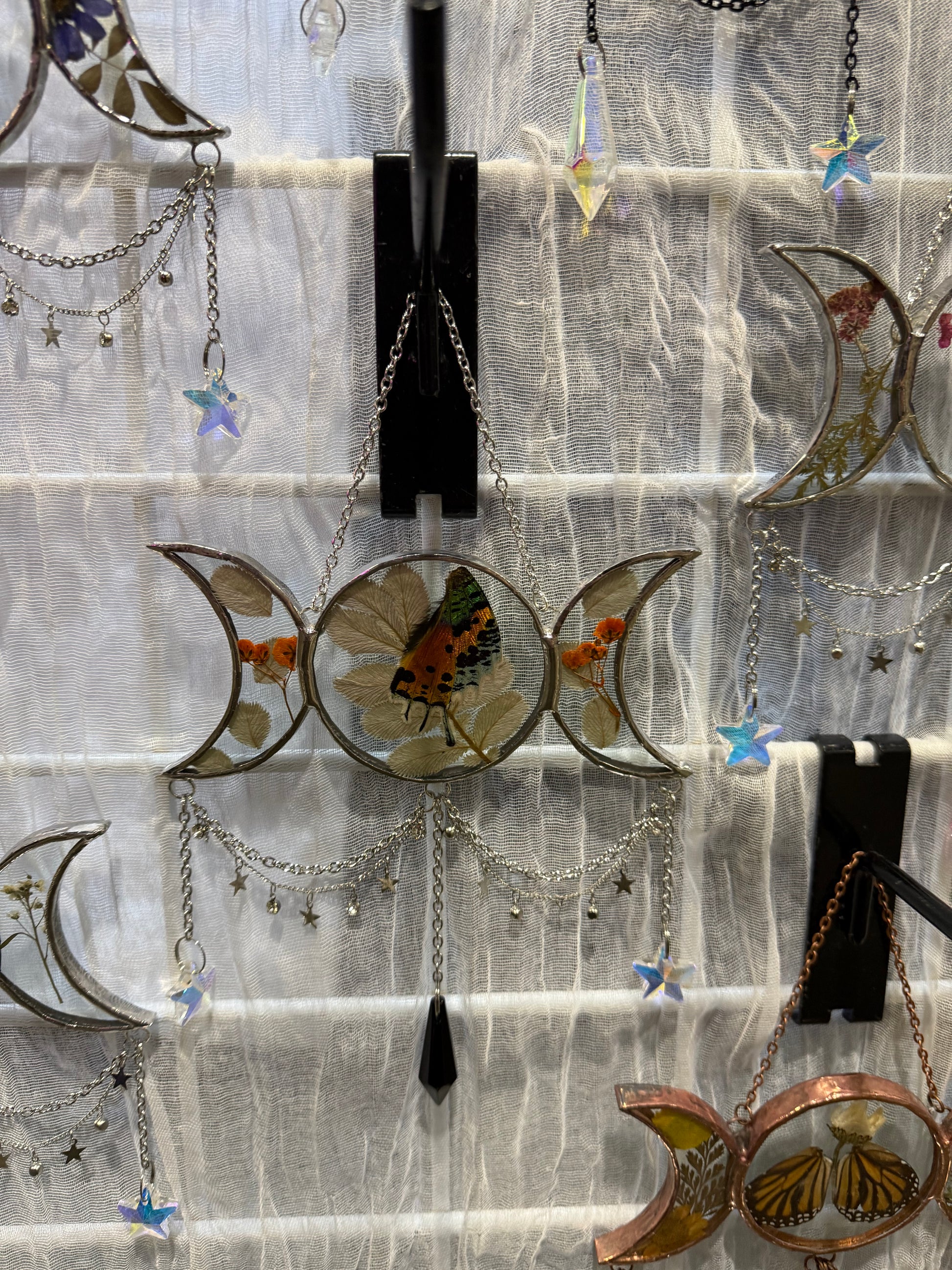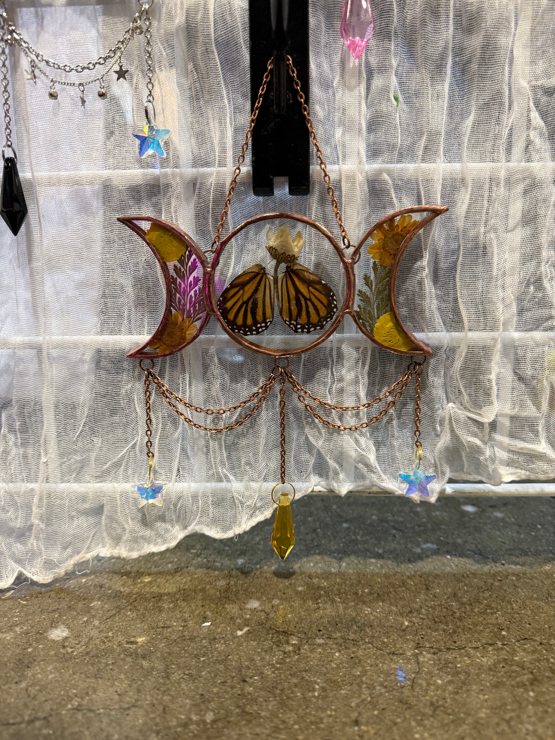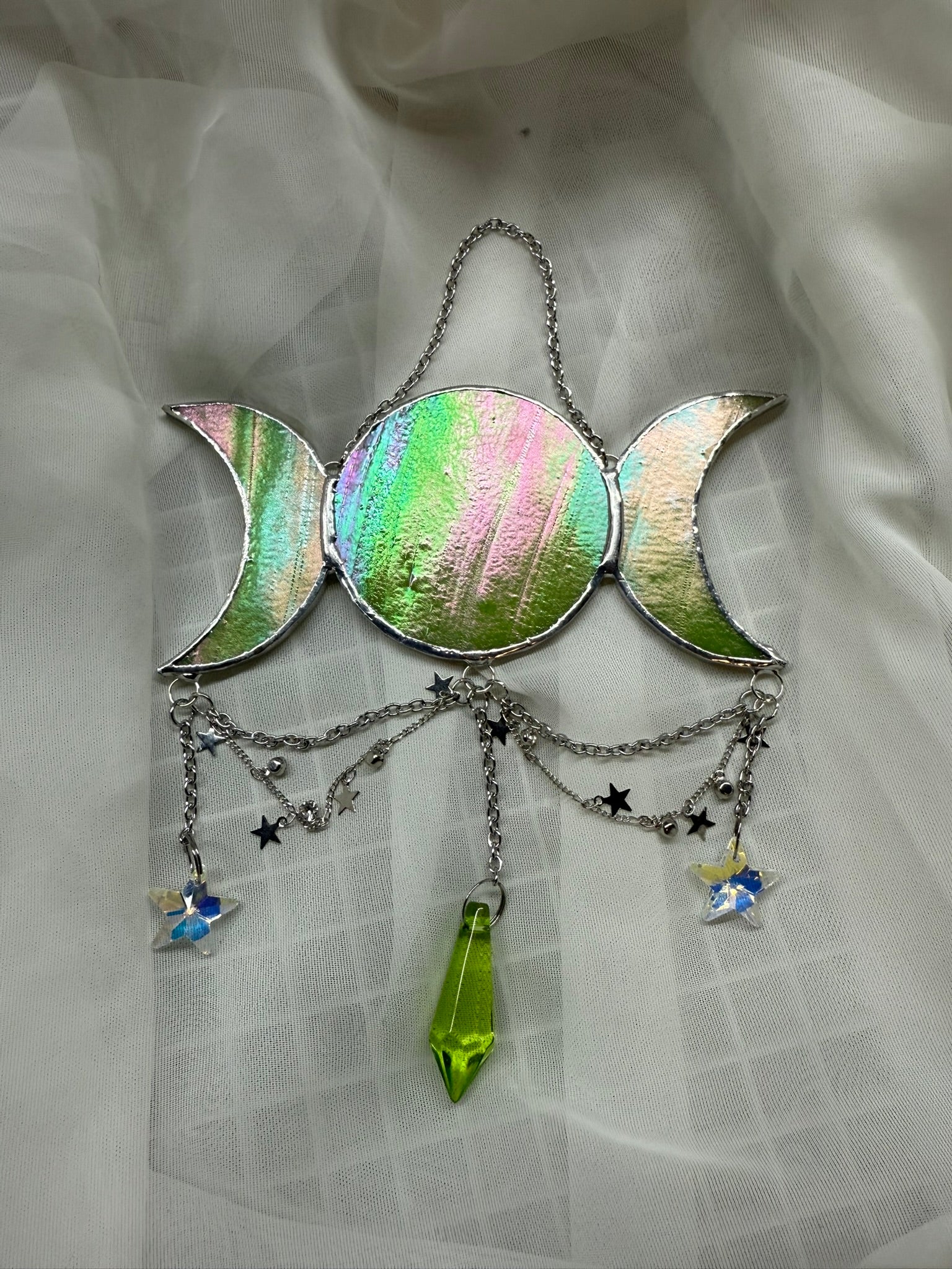 Bring a little magic to any interior with this enchanting stained glass Triple Moon sun catcher. Hang it in your windows and let its three crescent moons bring a touch of celestial light into your home!