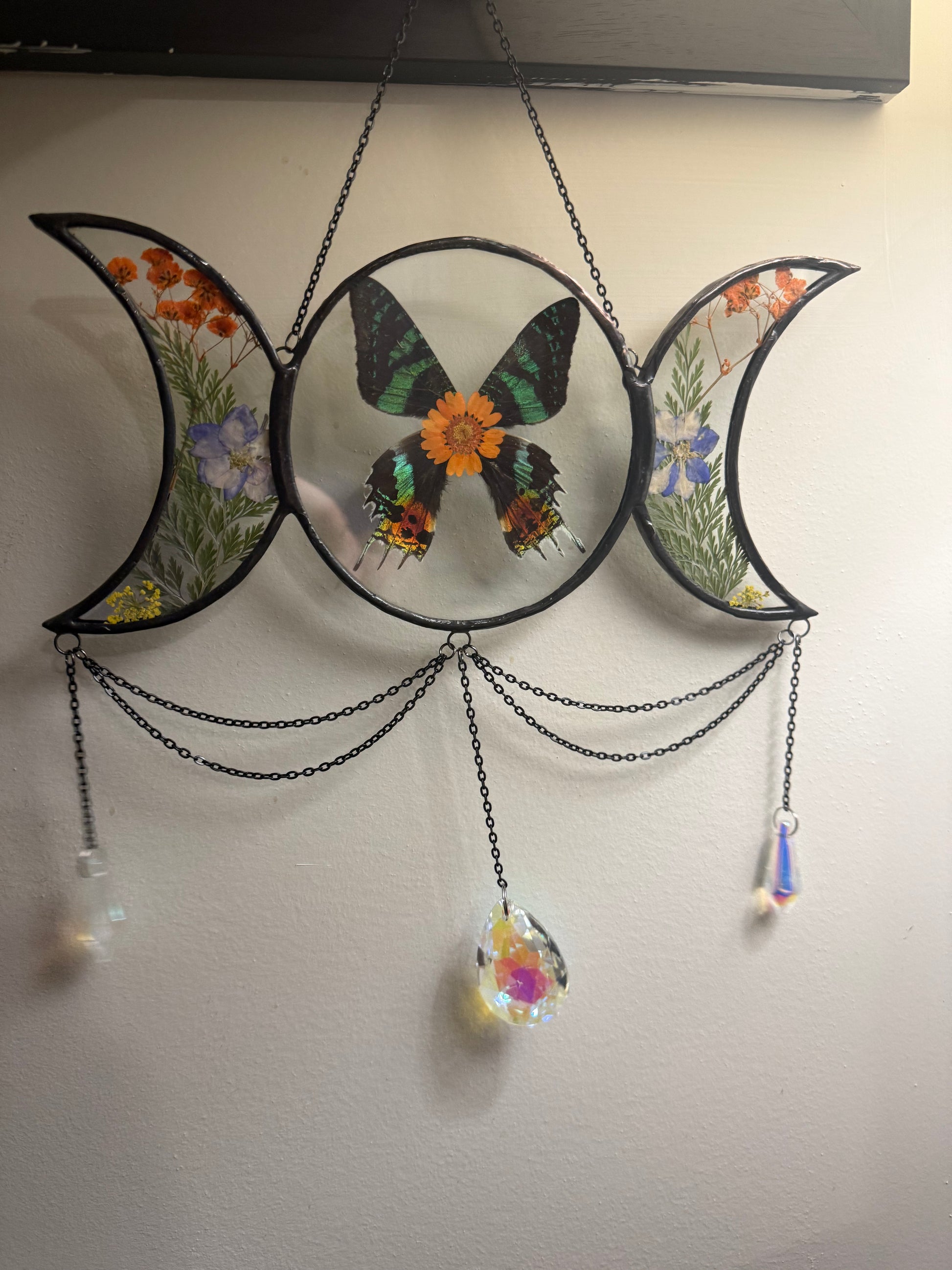 Bring a little magic to any interior with this enchanting stained glass Triple Moon sun catcher. Hang it in your windows and let its three crescent moons bring a touch of celestial light into your home!